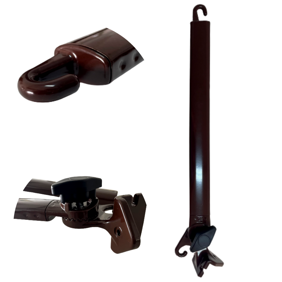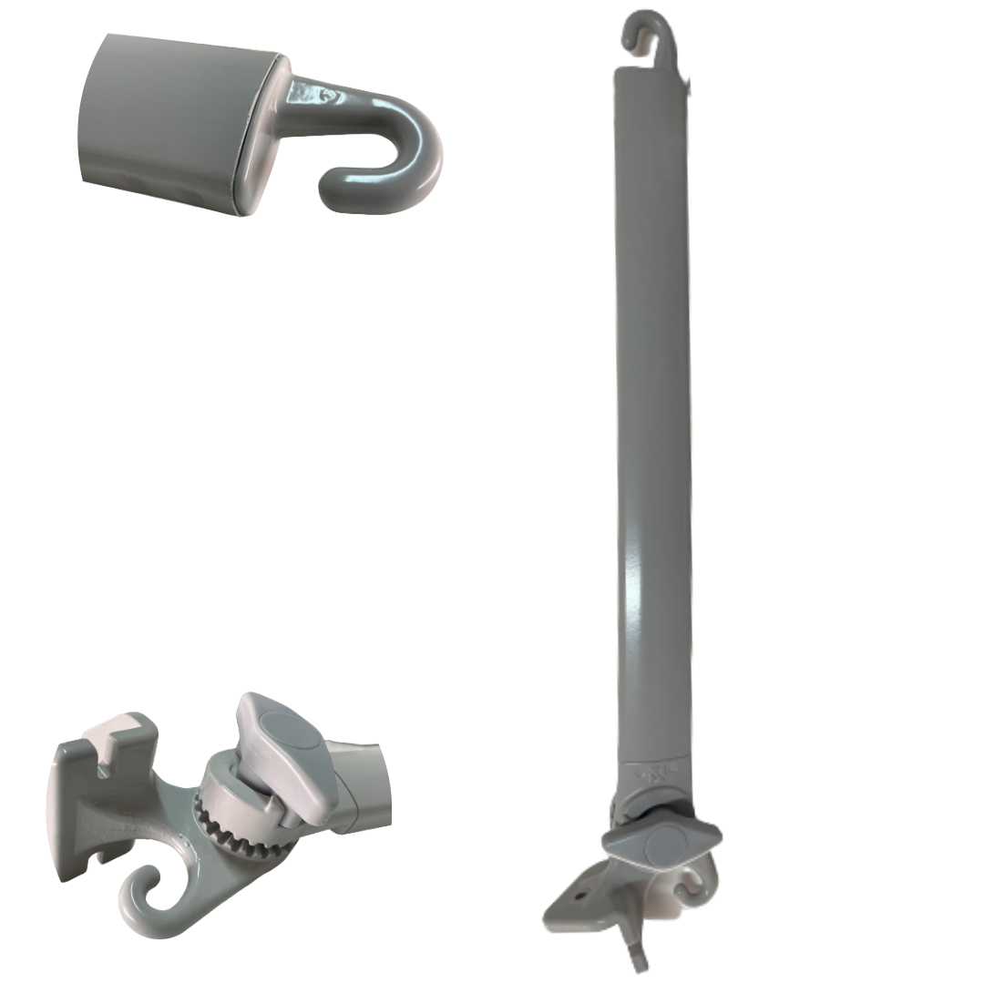 I braccetti sono regolabili su posizioni fisse da 0° a 180° tramite una apposita manopola di bloccaggio, con 7 scatti su 90° per garantire la massima comodità di aggancio. Ideale per sostituire il braccio rotto della tenda da sole per balcone.